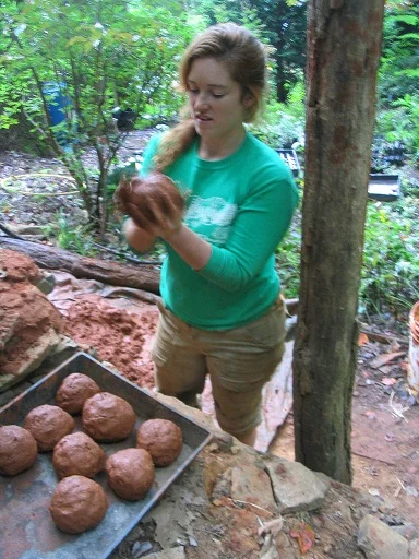 Tom Trout, a friend and local builder, came over to help us build a brick and cob oven to replace the one that was destroyed by a falling tulip poplar early this year. The brickwork took a large group of people one day to complete. The cob was added in two layers, over a period of several days. Most significantly, we have been able to bake several loaves of bread, sweet potatoes, and pizzas in our new oven!